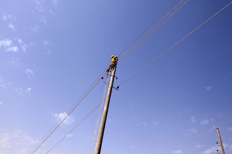 A Chinese worker attaches electricity cables to a utility pole. Photographer: Asim Hafeez/Bloomberg
