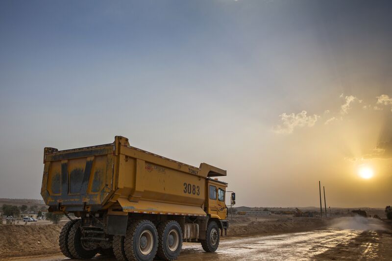 A kilometer from the living compounds, a massive square terraced hole is being carved out of the dust. Yellow Chinese dump trucks made by Shaanxi Tonly Heavy Industries Co. line up at the bottom to be filled with dirt by hydraulic excavators.