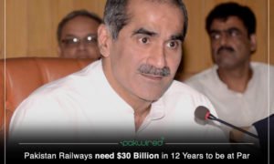 While addressing the media at a press conference on Thursday, the Federal Minister for Pakistan Railways, Khawaja Saad Rafique has stated that the Railway Pakistan needs enormous $30 billion over a period of next 12 years to be at par with the international standards.
