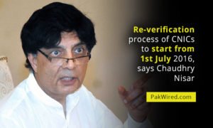 Interior Minister of Pakistan, Chaudhry Nisar Ali Khan, has approved the process of re-verification of Computerized National Identity Cards (CNICs) all over the country. The drive will start from 1st July 2016 declared in a meeting today.