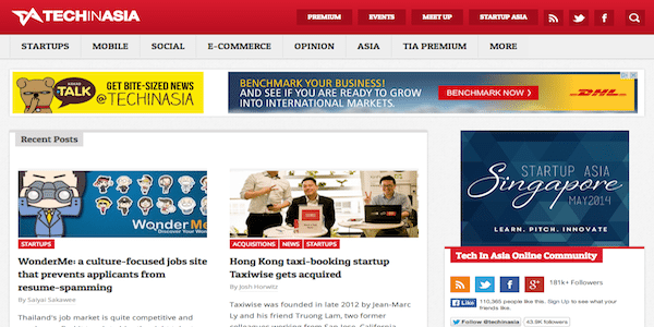TechInAsia provides up-to-date news and features on startups in Asia, including countries such as China, Pakistan, Thailand, Japan, India, Indonesia, Korea, Vietnam, Philippines, Malaysia and Singapore. It also covers mobile apps and developments, as well as social media and issues in e-commerce. It provides a well-rounded representation of developments in this area, broadly relating to the tech industry.