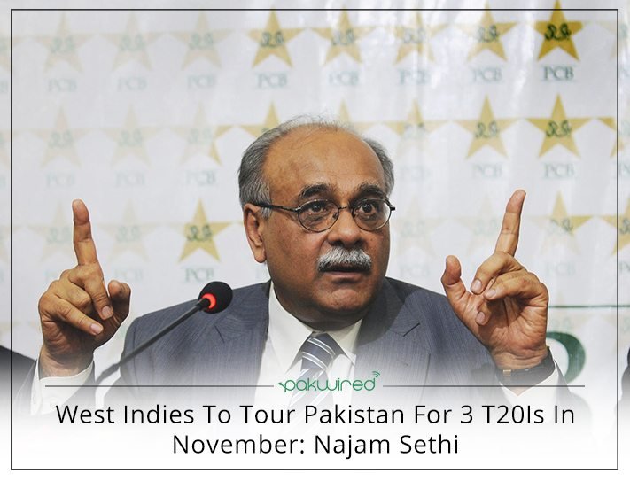 The chairman of Pakistan Cricket Board (PCB), Najam Sethi has announced that West Indies cricket team will be touring Pakistan for three T20Is in November this year. The development is confirmed by the West Indies Cricket Board (WICB) too.